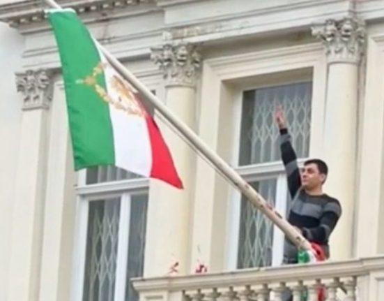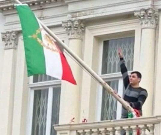 Protester scales Iranian Embassy in London, tears down regime flag, hoists pre-revolution symbol